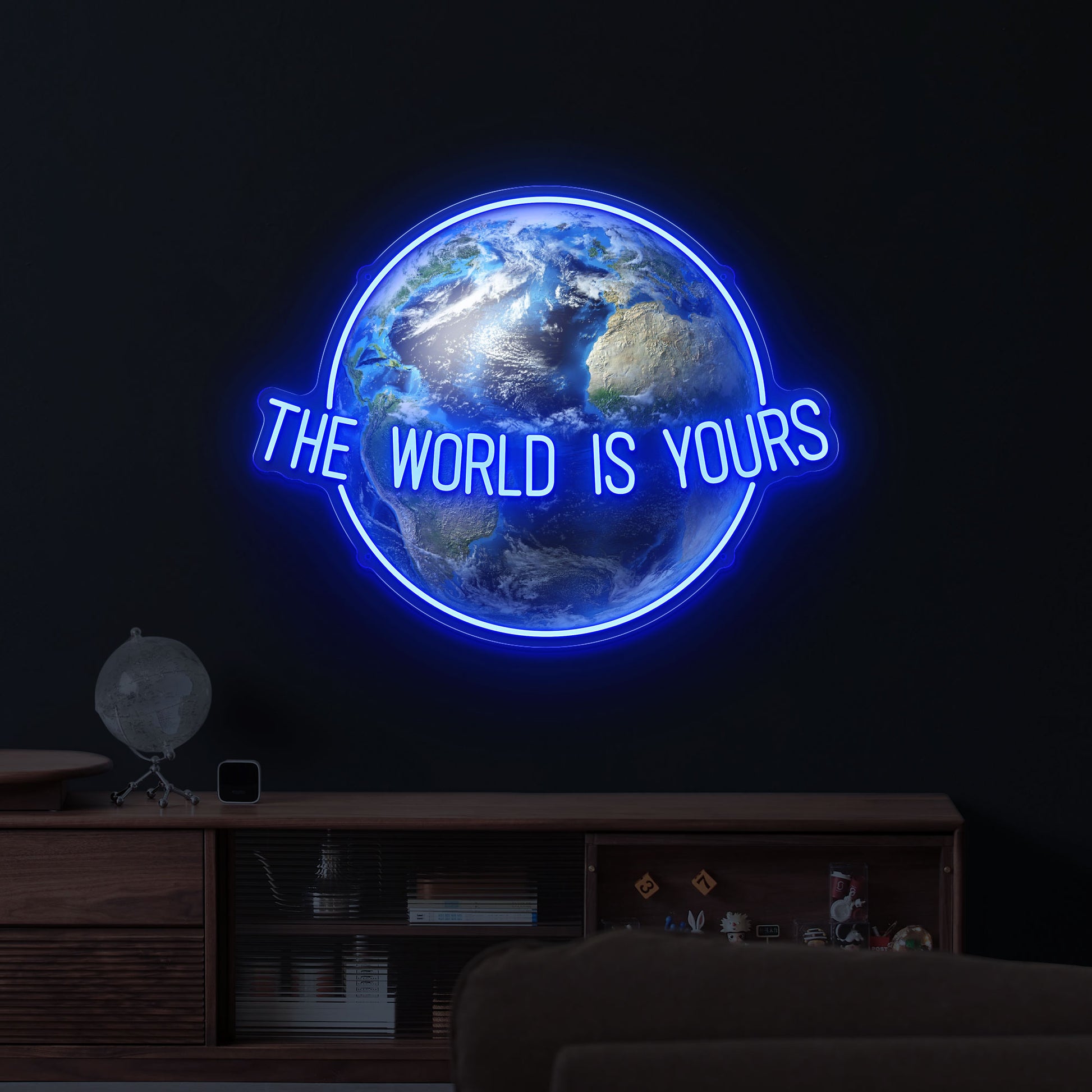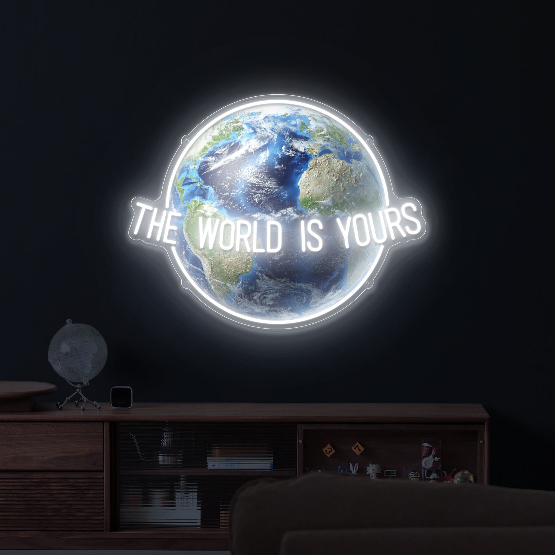 The World Is Yours Neon Sign β UV Printed Globe Backboard LED Wall Light, Motivational Quote Neon for Bedroom, Office or Bar Decor